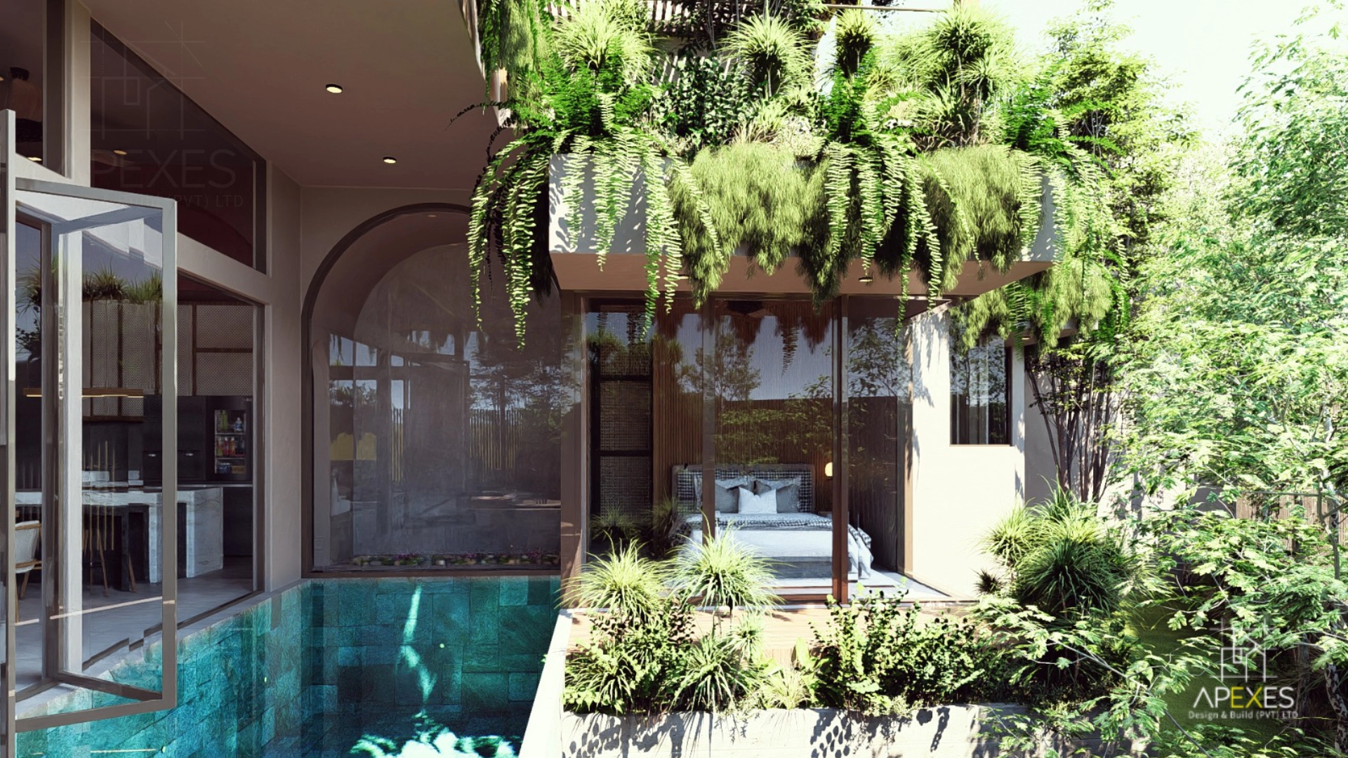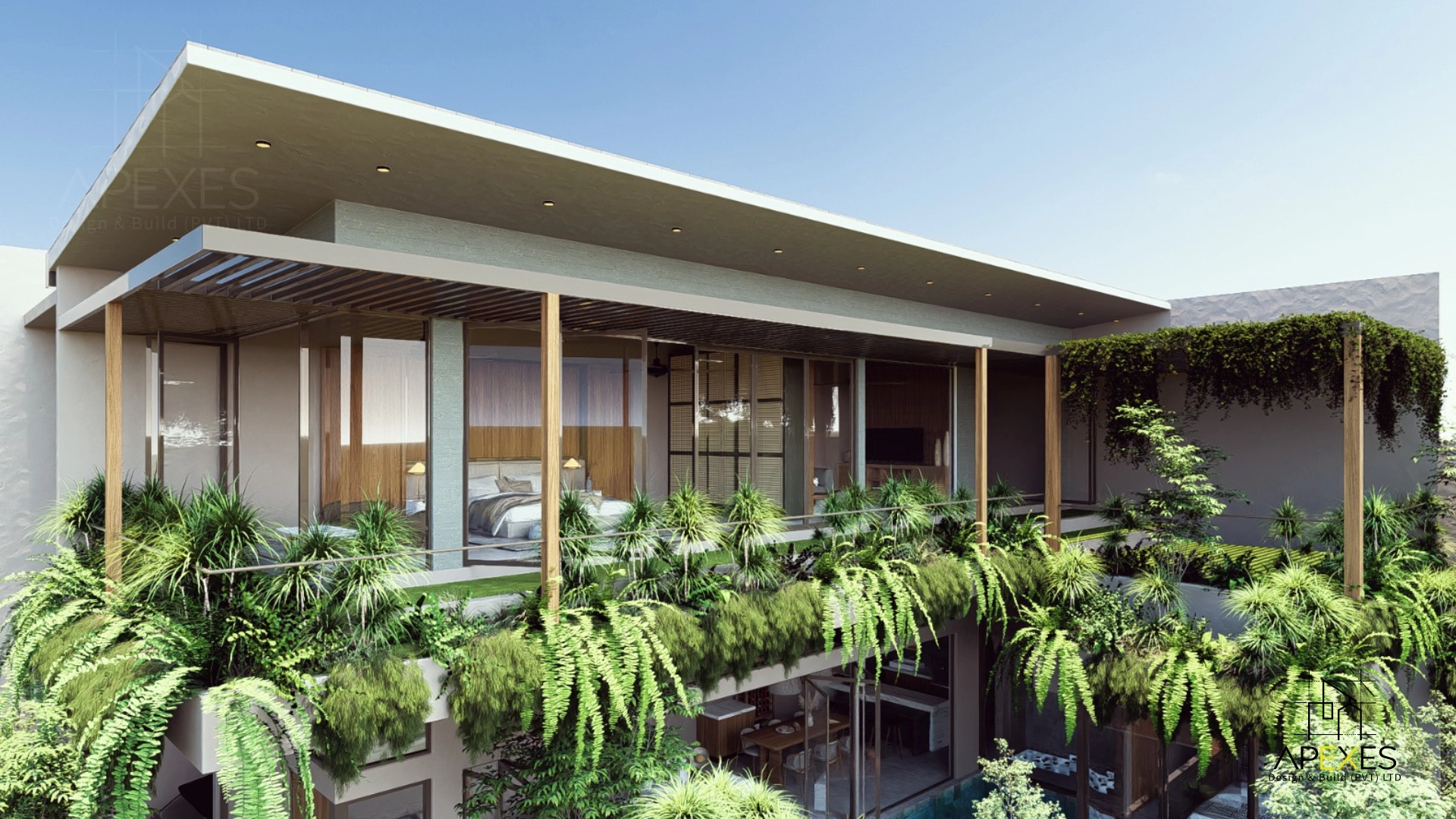 A visionary multi-level residence currently in development, featuring a tranquil poolside lounge and a master suite that defines urban luxury through sophisticated, simple lines.