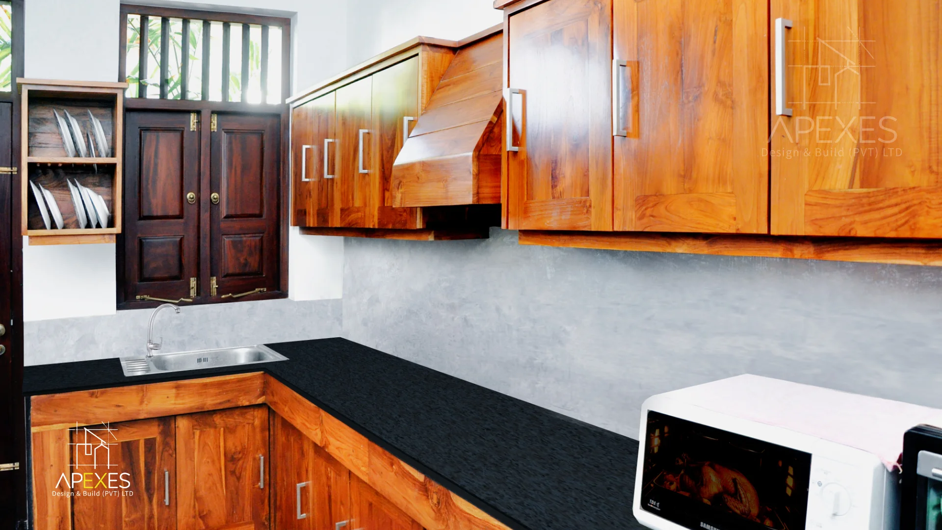 - Modern Utility: A sleek, minimalist kitchen featuring cement-toned backsplashes and dark countertops balances the warmth of the Teak wood storage units.